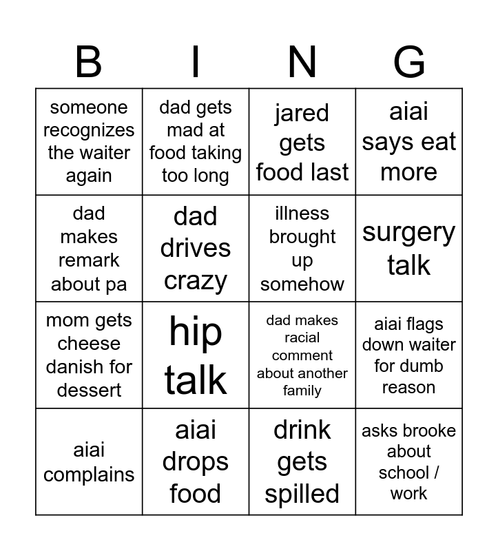 This bingo card has 16 words: aiai drops food, aiai flags down waiter for dumb reason, jared gets food last, someone recognizes the waiter again, mom gets cheese danish for dessert, dad gets mad at food taking too long, dad makes racial comment about another family, drink gets spilled, dad makes remark about pa, dad drives crazy, aiai complains, aiai says eat more, hip talk, surgery talk, illness brought up somehow and asks brooke about school / work.
