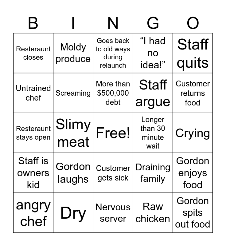 This bingo card has a free space and 72 words: Gordon finds bug, Moldy produce, Slimy meat, Warm fridge, Undercooked food, “This could kill somebody”, “I had no idea!”, “Shut it down”, Staff argue, Something’s broken, angry chef, Drops food on floor, Customer returns food, Resteraunt closes, No proper uniform, Resteraunt stays open, Draining family, Staff quits, Gordon gags, Crying, Gordon laughs, Gordon spits out food, Gordon enjoys food, Gordon brings staff to his resteraunt, Gordon gives life advice, Marriage counsling with gordon, Greasy food, No flavor, Frozen food, Overcooked food, Dry, Overpriced, Too big portion, Gordon gets sick, Raw chicken, Family staff, Hair in food, Trained chef, Untrained chef, Gordon throws something, Customer gets sick, Passionless chef, Owner lives in resteraunt, Stubborn owner, Confusing concept, Staff is owners kid, Unexpected thing in food, Gordon argues with chef, Undercover, Cross contamination, Family drama, Family photo on wall, Lying staff, Longer than 30 minute wait, Longer than hour wait, Wrong order, Goes back to old ways during relaunch, More than $500,000 debt, Owner has no experience, Underpaid staff, More than $100,000 debt, Staff member has the hots for Ramsey, Chef insults gordon, Nervous server, Cold food, Drains spouse of money, Screaming, Arrogant chef, “I don’t care about Gordon”, Gordon brings someone to help, Food hoarding and Health code violation.
