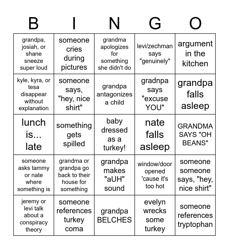 This bingo card has a free space and 34 words: someone offers kyra turkey :(, evelyn wrecks some turkey, someone wants to play village idiot, grandma calls someone the wrong name, someone asks tammy or nate where something is, someone says, "hey, nice shirt", argument in the kitchen, jeremy or levi talk about a conspiracy theory, someone cries during pictures, tammy, shelby, or emilia get scared, grandpa antagonizes a child, grandma apologizes for something she didn't do, shane falls asleep, someone spills something on their reunion shirt, nate falls asleep, grandpa falls asleep, someone references turkey coma, lunch is... late, grandma or grandpa go back to their house for something, window/door opened 'cause it's too hot, grandpa makes "aUH" sound, someone has to go outside to cool off, grandpa, josiah, or shane sneeze super loud, GRANDMA SAYS "OH BEANS", grandpa BELCHES, someone references tryptophan, levi/zechman says "genuinely", something gets burnt, gradnpa says "excuse YOU", kyle, kyra, or tesa disappear without explanation, jeremy says a fart joke, something gets spilled, someone someone says, "hey, nice shirt" and multiple kids crying at the same time.