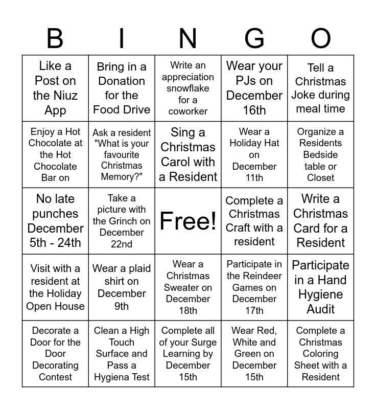 This bingo card has a free space and 24 words: Wear a plaid shirt on December 9th, Clean a High Touch Surface and Pass a Hygiena Test, Sing a Christmas Carol with a Resident, Decorate a Door for the Door Decorating Contest, Tell a Christmas Joke during meal time, Like a Post on the Niuz App, Enjoy a Hot Chocolate at the Hot Chocolate Bar on, Bring in a Donation for the Food Drive, Complete a Christmas Craft with a resident, Wear a Christmas Sweater on December 18th, Wear a Holiday Hat on December 11th, No late punches December 5th - 24th, Participate in the Reindeer Games on December 17th, Participate in a Hand Hygiene Audit, Ask a resident "What is your favourite Christmas Memory?", Wear Red, White and Green on December 15th, Write a Christmas Card for a Resident, Write an appreciation snowflake for a coworker, Organize a Residents Bedside table or Closet, Take a picture with the Grinch on December 22nd, Complete a Christmas Coloring Sheet with a Resident, Visit with a resident at the Holiday Open House, Wear your PJs on December 16th and Complete all of your Surge Learning by December 15th.