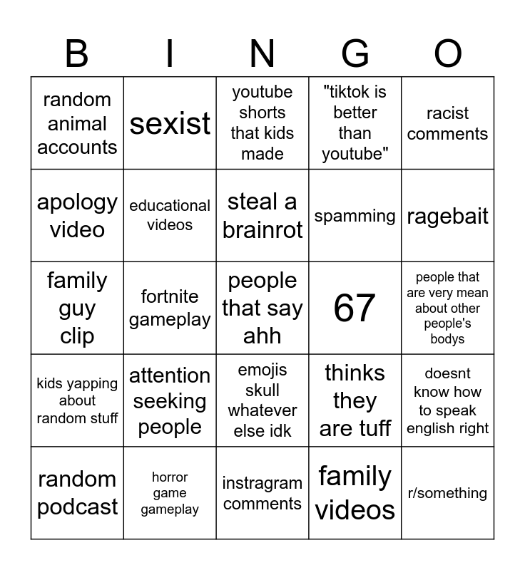 This bingo card has a free space and 24 words: attention seeking people, horror game gameplay, steal a brainrot, random podcast, racist comments, random animal accounts, apology video, sexist, 67, emojis skull whatever else idk, spamming, family guy clip, thinks they are tuff, doesnt know how to speak english right, educational videos, family videos, people that are very mean about other people's bodys, youtube shorts that kids made, ragebait, fortnite gameplay, r/something, kids yapping about random stuff, "tiktok is better than youtube" and instragram comments.