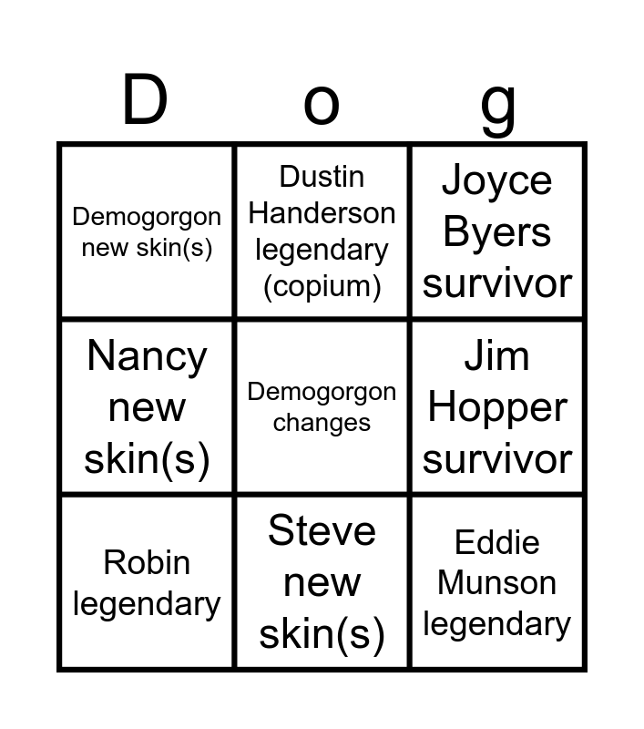 This bingo card has a free space and 8 words: Jim Hopper survivor, Joyce Byers survivor, Dustin Handerson legendary (copium), Robin legendary, Demogorgon new skin(s), Eddie Munson legendary, Nancy new skin(s) and Steve new skin(s).