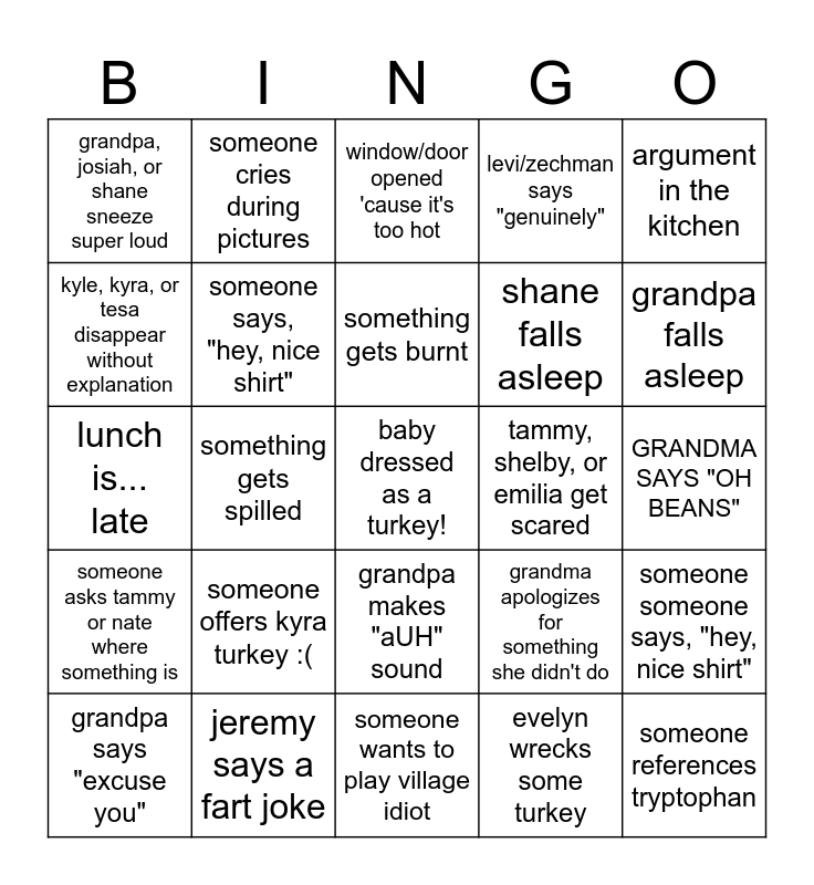This bingo card has a free space and 34 words: grandma or grandpa go back to their house for something, evelyn wrecks some turkey, grandpa BELCHES, grandma calls someone the wrong name, someone asks tammy or nate where something is, someone says, "hey, nice shirt", argument in the kitchen, grandpa says "excuse you", someone cries during pictures, nate falls asleep, something gets burnt, window/door opened 'cause it's too hot, jeremy or levi talk about a conspiracy theory, someone spills something on their reunion shirt, tammy, shelby, or emilia get scared, grandpa falls asleep, jeremy says a fart joke, lunch is... late, someone offers kyra turkey :(, grandma apologizes for something she didn't do, grandpa makes "aUH" sound, someone has to go outside to cool off, grandpa, josiah, or shane sneeze super loud, GRANDMA SAYS "OH BEANS", someone wants to play village idiot, someone references tryptophan, levi/zechman says "genuinely", grandpa antagonizes a child, shane falls asleep, kyle, kyra, or tesa disappear without explanation, someone references turkey coma, something gets spilled, someone someone says, "hey, nice shirt" and multiple kids crying at the same time.