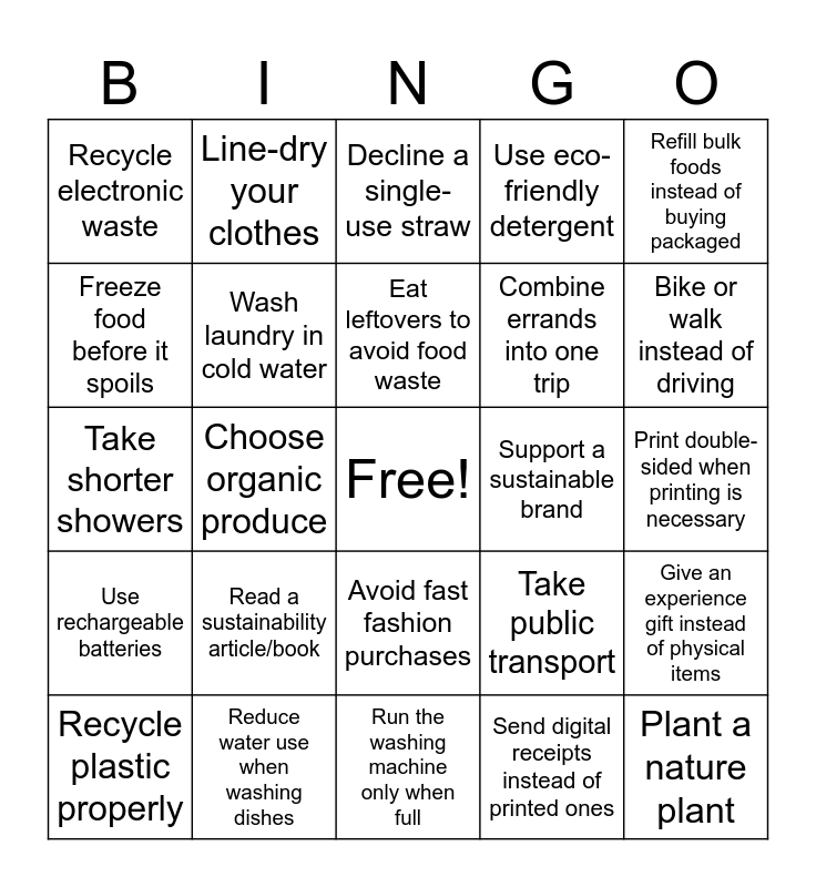This bingo card has a free space and 75 words: Bring a reusable water bottle, Use a reusable coffee cup, Decline a single-use straw, Bring your own shopping bag, Repair an item instead of replacing it, Donate clothes instead of throwing them away, Buy second-hand instead of new, Upcycle something at home, Compost food scraps, Start a worm bin or compost bin, Eat a plant-based meal, Eat a fully vegan day, Eat leftovers to avoid food waste, Freeze food before it spoils, Choose local produce, Choose organic produce, Grow herbs or vegetables at home, Plant a nature plant, Avoid food packaged in plastic, Refill bulk foods instead of buying packaged, Make your own cleaning product, Take shorter showers, Wash laundry in cold water, Line-dry your clothes, Use eco-friendly detergent, Turn off lights when leaving a room, Unplug unused electronics, Reduce thermostat use, Wear layers instead of using heating, Use a fan instead of AC, Use energy-efficient bulbs, Switch to green energy if possible, Carpool to work, Take public transport, Bike or walk instead of driving, Combine errands into one trip, Try a zero-waste day, Avoid printing documents, Print double-sided when printing is necessary, Send digital receipts instead of printed ones, Refuse a free promotional item you won’t use, Bring your own cutlery on the go, Bring your own food container to restaurants, Choose products in glass or metal instead of plastic, Choose products with recycled content, Recycle paper properly, Recycle plastic properly, Recycle electronic waste, Recycle batteries responsibly, Participate in a community cleanup, Pick up litter during a walk, Avoid fast fashion purchases, Create a capsule wardrobe, Mend a piece of clothing, Use a reusable razor, Install a low-flow showerhead, Track your carbon footprint, Switch to a sustainable bank, Support an environmental NGO, Volunteer for an environmental cause, Read a sustainability article/book, Watch a sustainability documentary, Share a sustainability tip with someone, Host a clothes-swap event, Buy from a local business, Support a sustainable brand, Reduce meat consumption, Avoid palm-oil-heavy snacks, Practice eco-friendly gift wrapping, Give an experience gift instead of physical items, Use rechargeable batteries, Reduce water use when washing dishes, Run the dishwasher only when full, Run the washing machine only when full and Avoid using disposable wipes.