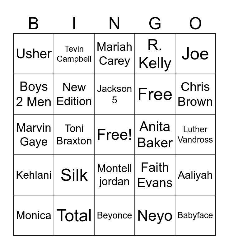 This bingo card has a free space and 25 words: Silk, Beyonce, Jackson 5, Monica, Joe, Usher, Boys 2 Men, Tevin Campbell, Anita Baker, Montell jordan, Free, Marvin Gaye, Faith Evans, Aaliyah, New Edition, Whitney Houston, Luther Vandross, Mariah Carey, Chris Brown, Toni Braxton, Babyface, Total, Kehlani, R. Kelly and Neyo.