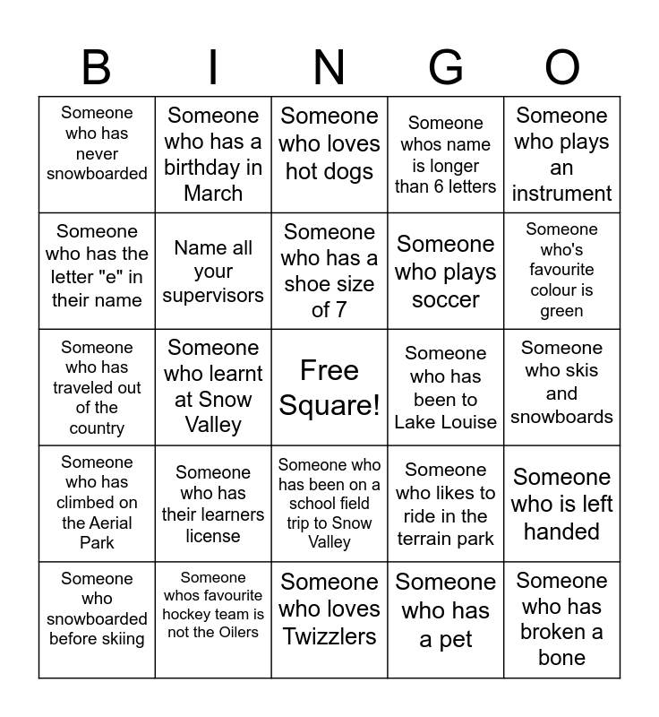 This bingo card has a free space and 29 words: Someone who snowboarded before skiing, Someone who has been to Marmot Basin, Someone who learnt at Snow Valley, Someone who has skied or snowboarded for 5+ Years, Someone who has never snowboarded, Someone who loves hot dogs, Name all your supervisors, Someone who has their learners license, Someone who has been to Lake Louise, Someone whos favourite hockey team is not the Oilers, Someone who skis and snowboards, Someone who has broken a bone, Someone who loves Twizzlers, Someone who has a pet, Someone who's favourite colour is green, Someone who played a video game today, Someone who has been on a school field trip to Snow Valley, Someone who has climbed on the Aerial Park, Someone who plays an instrument, Someone who has traveled out of the country, Someone who likes to ride in the terrain park, Someone who is the youngest in their family, Someone who plays soccer, Someone who has the letter "e" in their name, Someone whos name is longer than 6 letters, Someone who has a birthday in March, Someone who is left handed, Someone who has a shoe size of 7 and Someone who knows a second language.