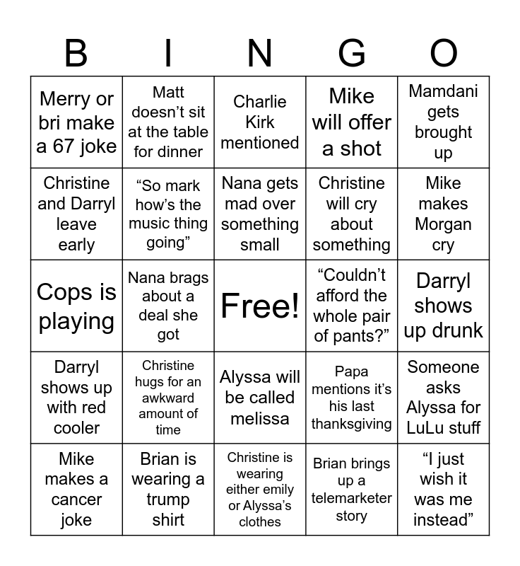 This bingo card has a free space and 24 words: Christine hugs for an awkward amount of time, Brian is wearing a trump shirt, Nana gets mad over something small, Mike makes a cancer joke, Mamdani gets brought up, Merry or bri make a 67 joke, Christine and Darryl leave early, Matt doesn’t sit at the table for dinner, “Couldn’t afford the whole pair of pants?”, Alyssa will be called melissa, Christine will cry about something, Cops is playing, Papa mentions it’s his last thanksgiving, Someone asks Alyssa for LuLu stuff, “So mark how’s the music thing going”, Brian brings up a telemarketer story, Darryl shows up drunk, Charlie Kirk mentioned, Mike makes Morgan cry, Nana brags about a deal she got, “I just wish it was me instead”, Darryl shows up with red cooler, Mike will offer a shot and Christine is wearing either emily or Alyssa’s clothes.