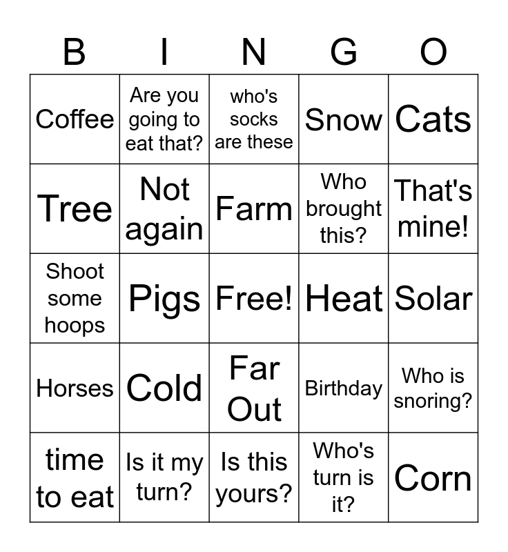 This bingo card has a free space and 39 words: Yap, niche, Fire, Not again, time to eat, Far Out, Farm, Dogs, Cats, Horses, Pigs, Snow, Corn, Solar, Heat, Cold, Wine, Coffee, Jesus, Birthday, Tree, Is this yours?, Who brought this?, That's mine!, That's Random, Is it time for Dessert?, Who wants to play?, I can't believe you said that!, That's so gross, Are you going to eat that?, Politics, insurance, who's socks are these, Is it my turn?, Who's turn is it?, I'm tired, Who is snoring?, Shoot some hoops and Let's play bags.