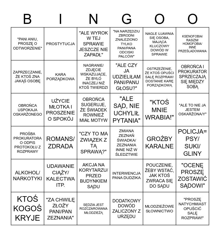 This bingo card has 36 words: INTERWENCJA PANA DUDZIKA, AKCJA NA KORYTARZU/ PRZED BUDYNKIEM SĄDU, DODATKOWY DOWÓD ZALICZONY Z URZĘDU, ZAPRZECZANIE, ŻE KTOŚ ZNA JAKĄŚ OSOBĘ, PROŚBA PROKURATORA O ODPIS PROTOKOŁU Z ROZPRAWY, "ALE SĄD, NIE UCHYLIŁ PYTANIA", KARA PORZĄDKOWA, SĘDZIA JEST ROZCZAROWANA MŁODZIEŻĄ, NAGLE UJAWNIA SIĘ OSOBA, MAJĄCA KLUCZOWY DOWÓD W SPRAWIE, POUCZENIE, ŻEBY WSTAĆ, JAK KTOŚ ZWRACA SIĘ DO SĄDU, OBROŃCA I PROKURATOR SPRZECZAJĄ SIĘ MIĘDZY SOBĄ, "NA NARZĘDZIU ZBRODNI ZNALEZIONO TYLKO PANI/PANA ODCISKI PALCÓW", "OCENĘ PROSZĘ ZOSTAWIĆ SĄDOWI", UŻYCIE MŁOTKA I PROSZENIE O SPOKÓJ, "ALE CZY JA UDZIELIŁAM PANI/PANU GŁOSU?", "PANI ANIU, PROSZĘ O ODTWORZENIE", ALKOHOL/ NARKOTYKI, "KTOŚ MNIE WRABIA!", OBROŃCA USPOKAJA OSKARŻONEGO, "ALE WYROK W TEJ SPRAWIE JESZCZE NIE ZAPADŁ", OBROŃCA SUGERUJE, ŻE ŚWIADEK ROWNIEŻ MIAŁ MOTYW, ROMANS/ ZDRADA, ZMIANA ZEZNAŃ ŚWIADKA/ ZEZNANIA INNE NIŻ W ŚLEDZTWIE, "CZY TO MA ZWIĄZEK Z TĄ SPRAWĄ?", GROŹBY KARALNE, PROSTYTUCJA, OSTRZEŻENIE, ŻE KTOŚ OPUŚCI SALĘ ROZPRAW/ DOSTANIE KARĘ PORZĄDKOWĄ, "ZA CHWILĘ ZŁOŻY PANI/PAN ZEZNANIA", NAGRANIE/ ZDJĘCIE WSKAZUJĄCE, ŻE BYŁO INACZEJ NIŻ KTOŚ TWIERDZI, KSENOFOBIA/ RASIZM/ HOMOFOBIA/ INNE PRZEŚLADOWANIA, "PROSZĘ NATYCHMIAST OPUŚCIĆ SALĘ ROZPRAW!", KTOŚ KOGOŚ KRYJE, POLICJA= PSY/ SUKI/ GLINY, "ALE TO NIE JA JESTEM OSKARŻONA/Y", UDAWANIE CIĄŻY/ KALECTWA ITP. and MŁODZIEŻOWE SŁOWNICTWO.