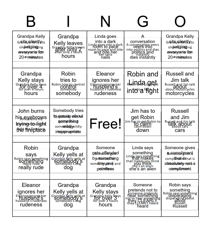 This bingo card has 24 images, a free space and 24 words: Grandpa Kelly yells at somebody’s dog, Grandpa Kelly yells at somebody’s dog, Eleanor ignores her husband’s rudeness, Eleanor ignores her husband’s rudeness, Grandpa Kelly sits silently judging everyone for 20+ minutes, Grandpa Kelly sits silently judging everyone for 20+ minutes, Grandpa Kelly stays for over 4 hours, Grandpa Kelly leaves after only 2 hours, Jim has to get Robin to calm down, Someone gets offended by something tiny and pointless, Robin and Linda get into a fight, John burns his eyebrows trying to light the fireplace, Linda says something that makes you think she’s an alien, Someone gives a compliment that is absolutely not a compliment, Robin tries to control somebody, Someone pretends not to hear something they CLEARLY heard, Russell and Jim talk about cars, Linda goes into a dark room to pace and bite her nails, Russell and Jim talk about motorcycles, Somebody tries to gossip about something wildly inappropriate, Robin says something disparaging about Russell, Robin says something really rude, A conversation veers into politics and dies instantly and Grandpa Kelly stays for over 3 hours.