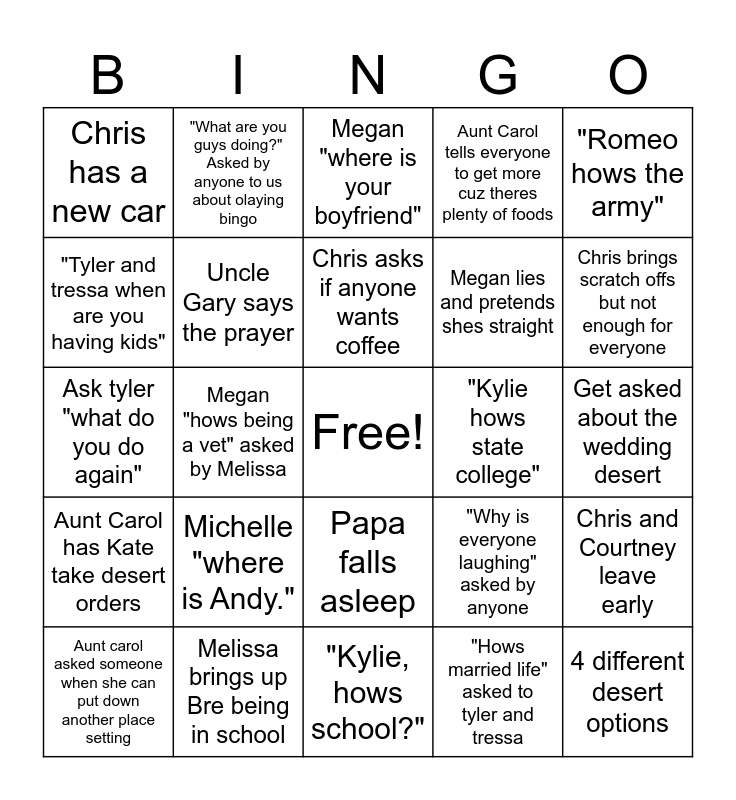 This bingo card has a free space and 24 words: Michelle "where is Andy.", Melissa brings up Bre being in school, Chris asks if anyone wants coffee, Aunt carol asked someone when she can put down another place setting, "Romeo hows the army", Chris has a new car, "Tyler and tressa when are you having kids", "What are you guys doing?" Asked by anyone to us about olaying bingo, "Kylie hows state college", Papa falls asleep, Megan lies and pretends shes straight, Ask tyler "what do you do again", "Why is everyone laughing" asked by anyone, Chris and Courtney leave early, Uncle Gary says the prayer, "Hows married life" asked to tyler and tressa, Get asked about the wedding desert, Megan "where is your boyfriend", Chris brings scratch offs but not enough for everyone, Megan "hows being a vet" asked by Melissa, 4 different desert options, Aunt Carol has Kate take desert orders, Aunt Carol tells everyone to get more cuz theres plenty of foods and "Kylie, hows school?".