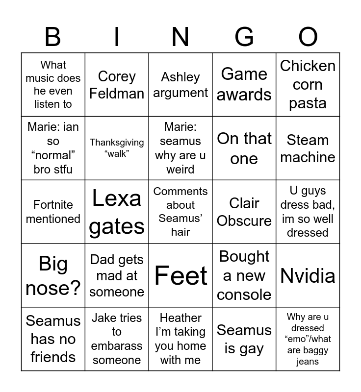 This bingo card has a free space and 24 words: Dad gets mad at someone, Jake tries to embarass someone, Marie: seamus why are u weird, Seamus has no friends, Chicken corn pasta, What music does he even listen to, Marie: ian so “normal” bro stfu, Corey Feldman, Clair Obscure, Feet, On that one, Fortnite mentioned, Bought a new console, Nvidia, Thanksgiving “walk”, Seamus is gay, U guys dress bad, im so well dressed, Ashley argument, Steam machine, Lexa gates, Why are u dressed “emo”/what are baggy jeans, Big nose?, Game awards and Heather I’m taking you home with me.
