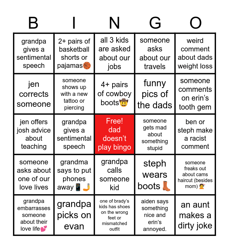 This bingo card has a free space and 24 words: grandma says to put phones away📱🤳, grandpa picks on evan, 4+ pairs of cowboy boots🤠, grandpa embarrasses someone about their love life💕, weird comment about dads weight loss, grandpa gives a sentimental speech, jen corrects someone, 2+ pairs of basketball shorts or pajamas🏀, someone gets mad about something stupid, grandpa calls someone kid, funny pics of the dads, jen offers josh advice about teaching, steph wears boots👢, someone freaks out about cams haircut (besides mom) 💇, someone shows up with a new tattoo or piercing, aiden says something nice and erin’s annoyed., ben or steph make a racist comment, all 3 kids are asked about our jobs, someone comments on erin’s tooth gem, grandpa gives a sentimental speech, an aunt makes a dirty joke, someone asks about one of our love lives, someone asks about our travels and one of brady’s kids has shoes on the wrong feet or mismatched outfit.