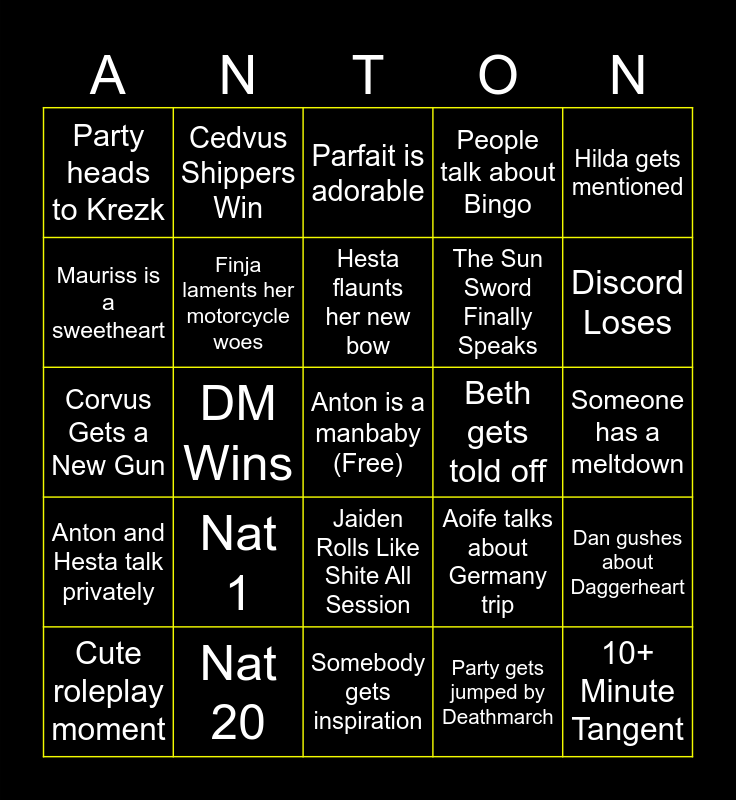 This bingo card has a free space and 24 words: Nat 1, Nat 20, Hesta flaunts her new bow, Cute roleplay moment, Hilda gets mentioned, Party heads to Krezk, Mauriss is a sweetheart, Cedvus Shippers Win, Beth gets told off, Jaiden Rolls Like Shite All Session, The Sun Sword Finally Speaks, Corvus Gets a New Gun, Aoife talks about Germany trip, Dan gushes about Daggerheart, Finja laments her motorcycle woes, Party gets jumped by Deathmarch, Someone has a meltdown, Parfait is adorable, Discord Loses, DM Wins, 10+ Minute Tangent, Anton and Hesta talk privately, People talk about Bingo and Somebody gets inspiration.