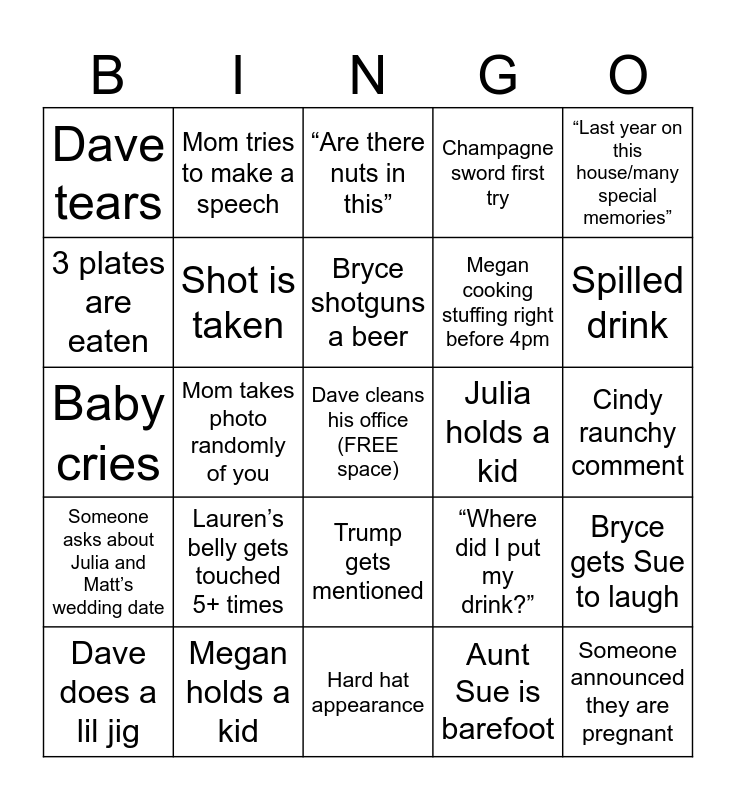 This bingo card has a free space and 24 words: Lauren’s belly gets touched 5+ times, Megan holds a kid, Bryce shotguns a beer, Dave does a lil jig, “Last year on this house/many special memories”, Dave tears, 3 plates are eaten, Mom tries to make a speech, Julia holds a kid, Trump gets mentioned, Megan cooking stuffing right before 4pm, Baby cries, “Where did I put my drink?”, Bryce gets Sue to laugh, Shot is taken, Aunt Sue is barefoot, Cindy raunchy comment, “Are there nuts in this”, Spilled drink, Mom takes photo randomly of you, Someone announced they are pregnant, Someone asks about Julia and Matt’s wedding date, Champagne sword first try and Hard hat appearance.