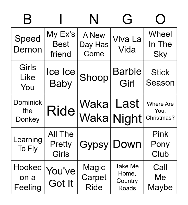 This bingo card has 40 words: Wouldn't It Be Nice, Dominick the Donkey, Brighter Than The Sun, Ice Ice Baby, You've Got It, Gypsy, Shoop, Around The Way Girl, Wheel In The Sky, Learning To Fly, Ride, Viva La Vida, Waka Waka, Where Are You, Christmas?, Last Night, All The Pretty Girls, I Love Rock and Roll, Speed Demon, Hurts So Good, A New Day Has Come, Pink Pony Club, Take Me Home, Country Roads, Barbie Girl, Girls Like You, All About That Bass, You're a Mean One Mr. Grinch, Africa, Three Little Birds, Call Me Maybe, My Way, We Don't Have to Take Our Clothes Off, Hooked on a Feeling, The Dock of the Bay, Down, Stick Season, Magic Carpet Ride, Broadway Girls, Fishin' In the Dark, My Ex's Best friend and God's Plan.