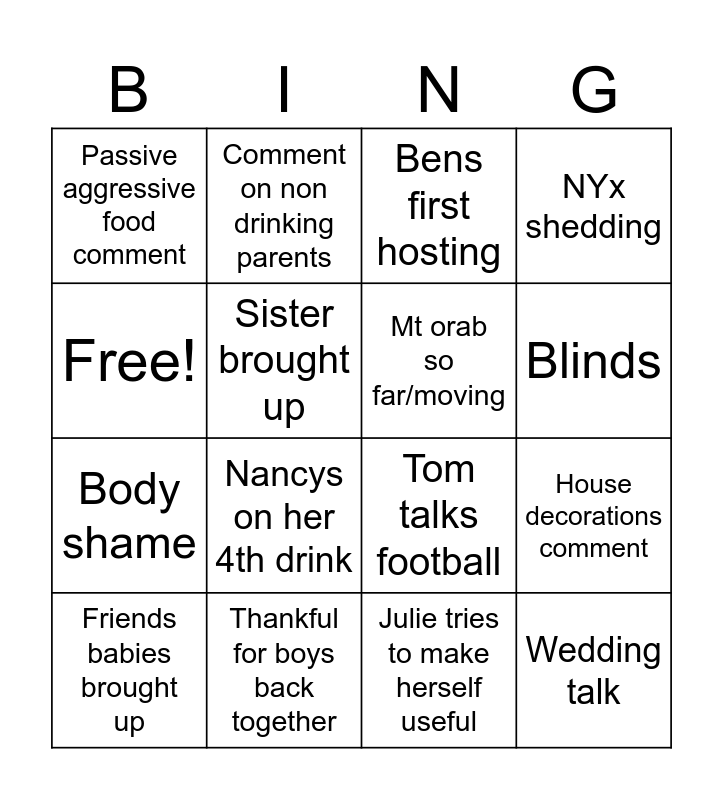 This bingo card has 16 words: Thankful for boys back together, House decorations comment, Bens first hosting, Passive aggressive food comment, Body shame, Comment on non drinking parents, Tom talks football, Julie tries to make herself useful, Free!, Sister brought up, Friends babies brought up, NYx shedding, Nancys on her 4th drink, Blinds, Mt orab so far/moving and Wedding talk.