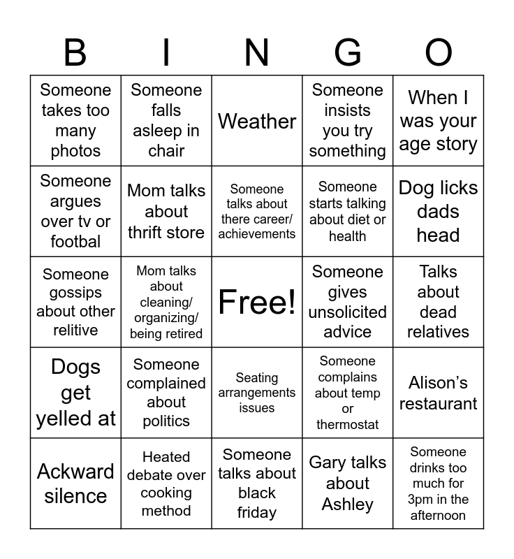 This bingo card has a free space and 24 words: Someone complained about politics, Heated debate over cooking method, Someone talks about there career/ achievements, Ackward silence, When I was your age story, Someone takes too many photos, Someone argues over tv or footbal, Someone falls asleep in chair, Someone gives unsolicited advice, Seating arrangements issues, Someone starts talking about diet or health, Someone gossips about other relitive, Someone complains about temp or thermostat, Alison’s restaurant, Mom talks about thrift store, Gary talks about Ashley, Talks about dead relatives, Weather, Dog licks dads head, Mom talks about cleaning/ organizing/ being retired, Someone drinks too much for 3pm in the afternoon, Dogs get yelled at, Someone insists you try something and Someone talks about black friday.