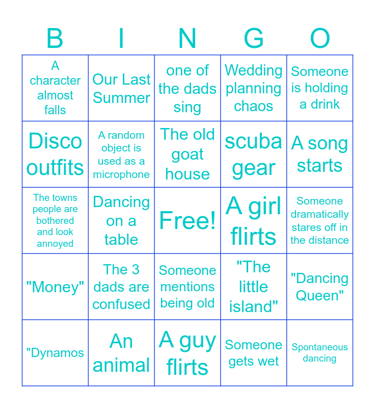 This bingo card has a free space and 29 words: "Dynamos, Rosie's lone wolf howl, Dancing on a table, The "good old days", A character almost falls, one of the dads sing, A random object is used as a microphone, The 3 dads are confused, A girl flirts, An animal, Someone dramatically stares off in the distance, Spontaneous dancing, A guy flirts, Someone gets wet, A song starts, "Sophie!", Someone mentions being old, "Money", Someone is holding a drink, The towns people are bothered and look annoyed, "The little island", Motherly love, scuba gear, Disco outfits, Wedding planning chaos, Our Last Summer, "Dancing Queen", The old goat house and "Honey Honey".