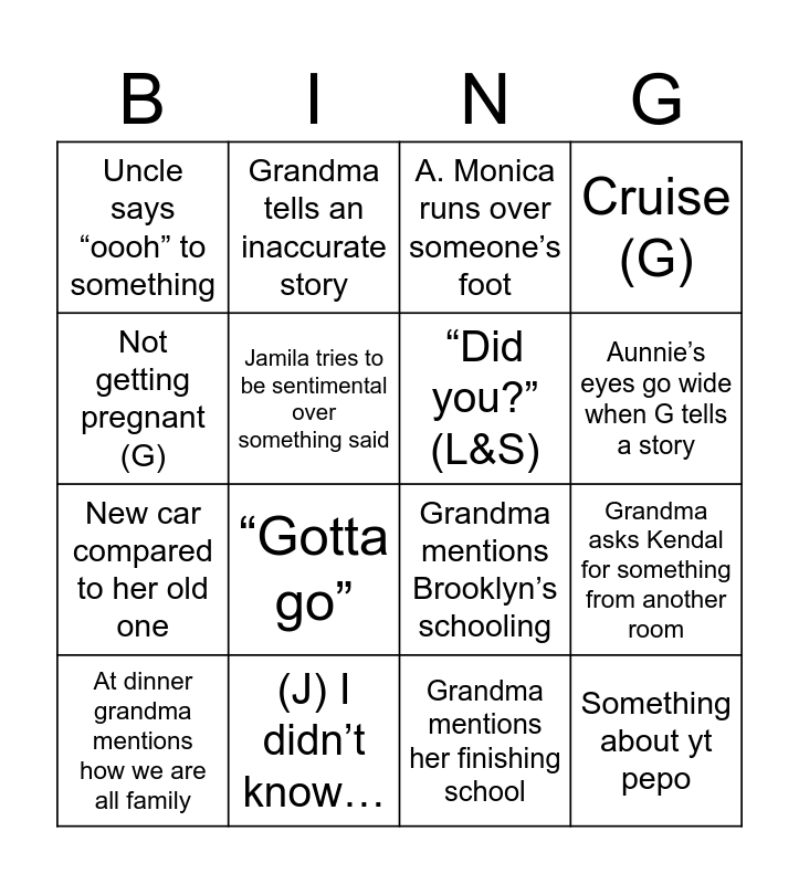 This bingo card has 16 words: (J) I didn’t know…, Grandma asks Kendal for something from another room, A. Monica runs over someone’s foot, Uncle says “oooh” to something, New car compared to her old one, Grandma tells an inaccurate story, Grandma mentions Brooklyn’s schooling, Grandma mentions her finishing school, Not getting pregnant (G), Jamila tries to be sentimental over something said, At dinner grandma mentions how we are all family, Cruise (G), “Gotta go”, Aunnie’s eyes go wide when G tells a story, “Did you?” (L&S) and Something about yt pepo.