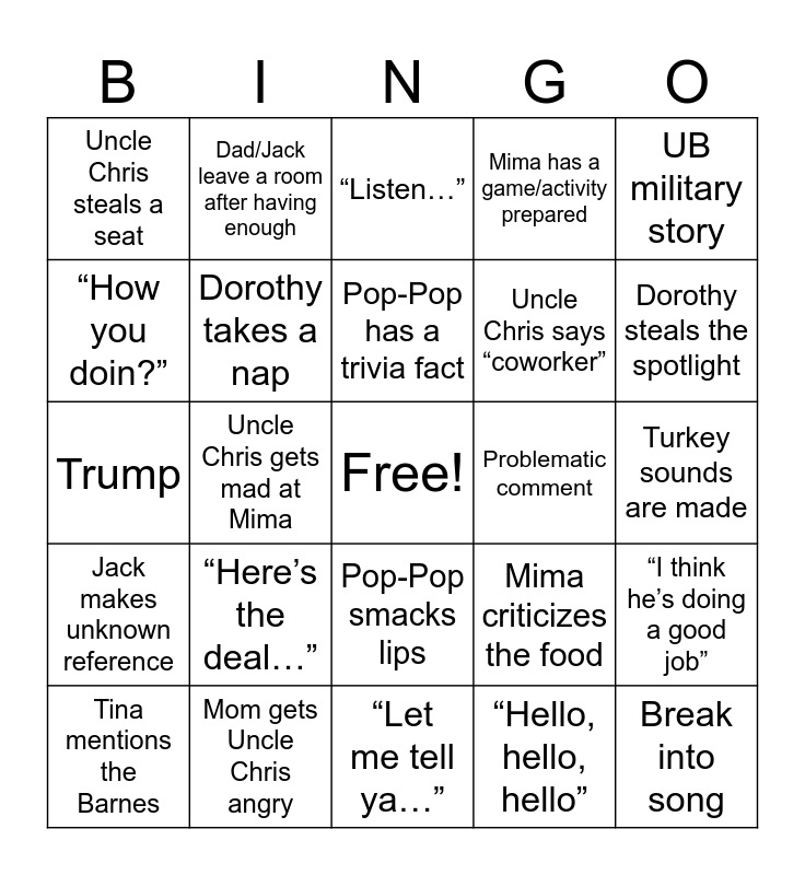 This bingo card has a free space and 24 words: Tina mentions the Barnes, “Here’s the deal…”, Pop-Pop has a trivia fact, “Hello, hello, hello”, UB military story, Uncle Chris steals a seat, Dad/Jack leave a room after having enough, “Listen…”, Problematic comment, Turkey sounds are made, Trump, Dorothy takes a nap, Mima criticizes the food, “I think he’s doing a good job”, “How you doin?”, Mom gets Uncle Chris angry, “Let me tell ya…”, Mima has a game/activity prepared, Dorothy steals the spotlight, Jack makes unknown reference, Uncle Chris gets mad at Mima, Pop-Pop smacks lips, Uncle Chris says “coworker” and Break into song.