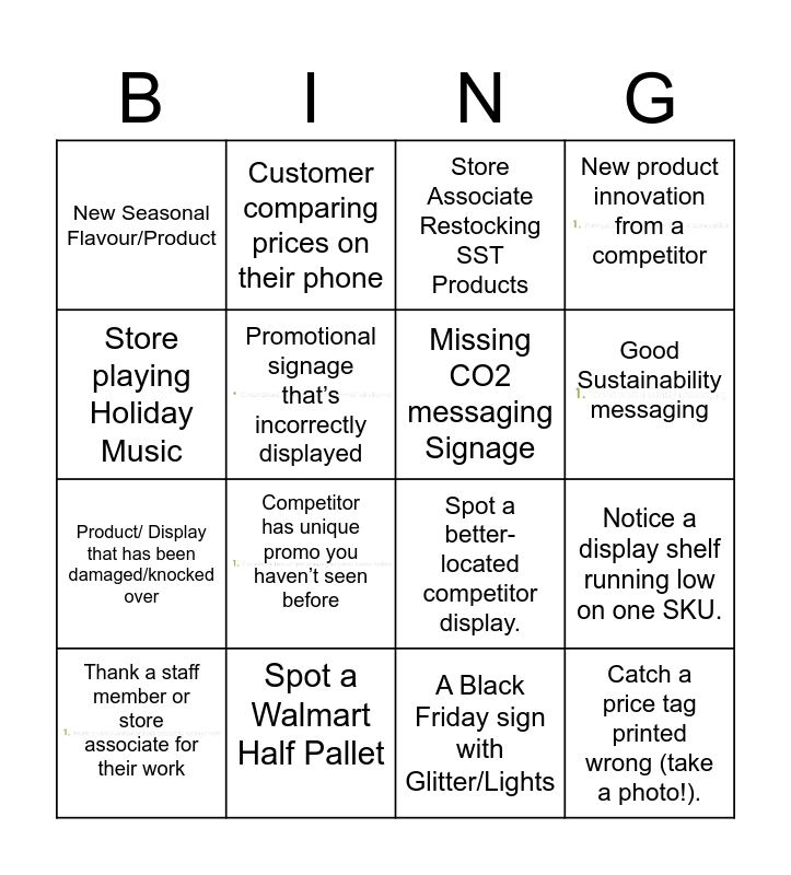 This bingo card has 5 images and 16 words: Spot a Walmart Half Pallet, Notice a display shelf running low on one SKU., Store Associate Restocking SST Products, New Seasonal Flavour/Product, Product/ Display that has been damaged/knocked over, Customer comparing prices on their phone, Spot a better-located competitor display., A Black Friday sign with Glitter/Lights, Store playing Holiday Music, Promotional signage that’s incorrectly displayed, Thank a staff member or store associate for their work, New product innovation from a competitor, Competitor has unique promo you haven’t seen before, Good Sustainability messaging, Missing CO2 messaging Signage and Catch a price tag printed wrong (take a photo!)..
