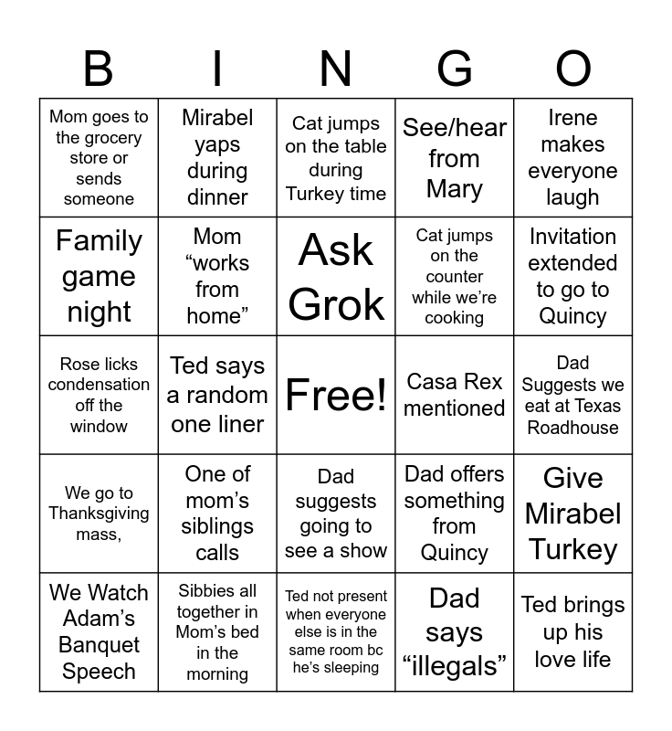 This bingo card has a free space and 29 words: We Watch Adam’s Banquet Speech, Max Calls on Thanksgiving, Ted says a random one liner, Dad says “The Good Cat”, Mom goes to the grocery store or sends someone, Cat jumps on the table during Turkey time, Mom “works from home”, One of mom’s siblings calls, Casa Rex mentioned, Sibbies all together in Mom’s bed in the morning, Dad Suggests we eat at Texas Roadhouse, Ted brings up his love life, Ted not present when everyone else is in the same room bc he’s sleeping, Dad says “illegals”, Invitation extended to go to Quincy, Family Walk, Dad suggests going to see a show, We go to Thanksgiving mass,, Irene makes everyone laugh, Rose licks condensation off the window, Dad offers something from Quincy, Joe’s tuition comes up, Cat jumps on the counter while we’re cooking, Family game night, See/hear from Mary, Mirabel yaps during dinner, Give Mirabel Turkey, Ask Grok and Dad offers drinks..