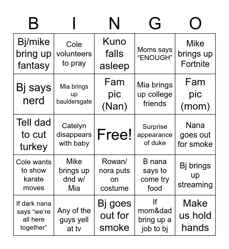 This bingo card has a free space and 24 words: If dark nana says “we’re all here together”, Mike brings up dnd w/ Mia, Fam pic (Nan), If mom&dad bring up a job to bj, Mike brings up Fortnite, Bj/mike bring up fantasy, Cole volunteers to pray, Kuno falls asleep, Surprise appearance of duke, Nana goes out for smoke, Tell dad to cut turkey, Mia brings up bauldersgate, B nana says to come try food, Bj brings up streaming, Bj says nerd, Any of the guys yell at tv, Bj goes out for smoke, Moms says “ENOUGH”, Fam pic (mom), Cole wants to show karate moves, Catelyn disappears with baby, Rowan/ nora puts on costume, Mia brings up college friends and Make us hold hands.