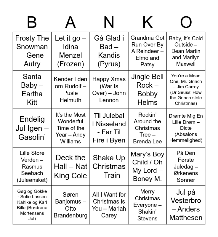 This bingo card has a free space and 51 words: Last Christmas – Wham!, Jul på Vesterbro – Anders Matthesen, Jul Det Cool – MC Einer, All I Want for Christmas is You – Mariah Carey, Deck the Hall – Nat King Cole, Feliz Navidad – José Feliciano, Let it go – Idina Menzel (Frozen), Do You Want To Build A Snowman? – Agatha Lee Monn, Katie Lopez, Kristen Bell (Frozen), Santa Baby – Eartha Kitt, Winter Wonderland – Michael Bublé, Kender I den om Rudolf – Pusle Helmuth, Grandma Got Run Over By A Reindeer – Elmo and Patsy, På Den Første Juledag – Ørkenens Sønner, Mary’s Boy Child / Oh My Lord – Boney M., Here Comes Santa Claus (Down Santa Claus Lane) – Doris Day, Let It Snow! Let It Snow! Let It Snow! - Frank Sinatra, Happy Xmas (War Is Over) – John Lennon, Rockin’ Around the Christmas Tree – Brenda Lee, It’s Beginning to Look a Lot Like Christmas – Perry Como, Baby, It’s Cold Outside – Dean Martin and Marilyn Maxwell, It’s the Most Wonderful Time of the Year – Andy Williams, Merry Christmas Everyone – Shakin’ Stevens, Frosty The Snowman – Gene Autry, Jingle Bell Rock – Bobby Helms, Underneath the Tree – Kelly Clarkson, Mistletoe – Justin Bieber, You’re a Mean One, Mr. Grinch – Jim Carrey (Dr Seuss’ How the Grinch stole Christmas), Flødebolleræs – Sofie Lassen Kahlke og Karl Bille (Brødrene Mortensens Jul), Gøg og Gokke - Sofie Lassen Kahlke og Karl Bille (Brødrene Mortensens Jul), Gå Glad i Bad – Kandis (Pyrus), Hvis Det Var Mig Der Bestemte - Pyrus, Risengrød – Birthe Neumann (Krummernes Jul), Jul I Angora – Drengene fra Angora, The Støvle Dance – De Nattergale (The Julekalender), Guld Jul – Gulddreng (Malte Ebert), Søren Banjomus – Otto Brandenburg, Det Kan Du Få For En Krone - Jullerup Færgeby, Julefeber – Oh Land, Tinka – Burhan G og Frida Brygmann, Vi Er På Vej Til Dig, Julemand - Bamses Julerejse, Drømte Mig En Lille Drøm – Dicte (Absalons Hemmelighed), Lille Store Verden – Rasmus Seebach (Juleønsket), Risengrødsangen – Nissebanden I Grønland, Det’cember – Sys Bjerre, Let love be love – Juice, S.O.A.P., Christina og Remee, Blue Christmas – Elvis Presley, Endelig Jul Igen – Gasolin’, I Saw Mommy Kissing Santa Claus – The Jackson 5, Santa Claus Is Coming To Town – The Jackson 5, Shake Up Christmas – Train and Driving Home for Christmas – Chris Rea.