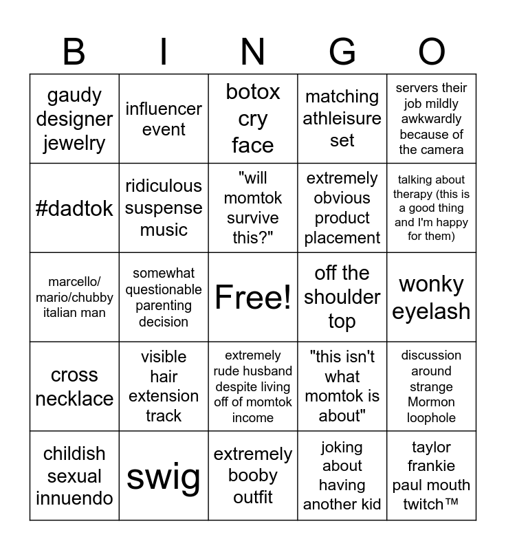 This bingo card has a free space and 24 words: visible hair extension track, swig, "will momtok survive this?", childish sexual innuendo, servers their job mildly awkwardly because of the camera, gaudy designer jewelry, #dadtok, influencer event, off the shoulder top, extremely rude husband despite living off of momtok income, extremely obvious product placement, marcello/ mario/chubby italian man, "this isn't what momtok is about", discussion around strange Mormon loophole, ridiculous suspense music, joking about having another kid, wonky eyelash, botox cry face, talking about therapy (this is a good thing and I'm happy for them), somewhat questionable parenting decision, taylor frankie paul mouth twitch™, cross necklace, matching athleisure set and extremely booby outfit.