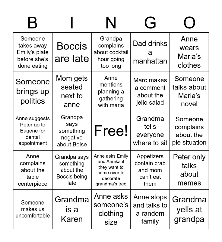 This bingo card has a free space and 24 words: Grandpa says something about the Boccis being late, Grandma is a Karen, Anne mentions planning a gathering with maria, Someone makes us uncomfortable, Anne wears Maria’s clothes, Someone takes away Emily’s plate before she’s done eating, Someone brings up politics, Boccis are late, Grandma tells everyone where to sit, Anne asks Emily and Annika if they want to come over to decorate grandma’s tree, Marc makes a comment about the jello salad, Anne suggests Peter go to Eugene for dental appointment, Appetizers contain crab and mom can’t eat them, Peter only talks about memes, Mom gets seated next to anne, Anne stops and talks to a random family, Someone complains about the pie situation, Grandpa complains about cocktail hour going too long, Someone talks about Maria’s novel, Grandpa says something negative about Boise, Grandma yells at grandpa, Anne complains about the table centerpiece, Dad drinks a manhattan and Anne asks someone’s clothing size.