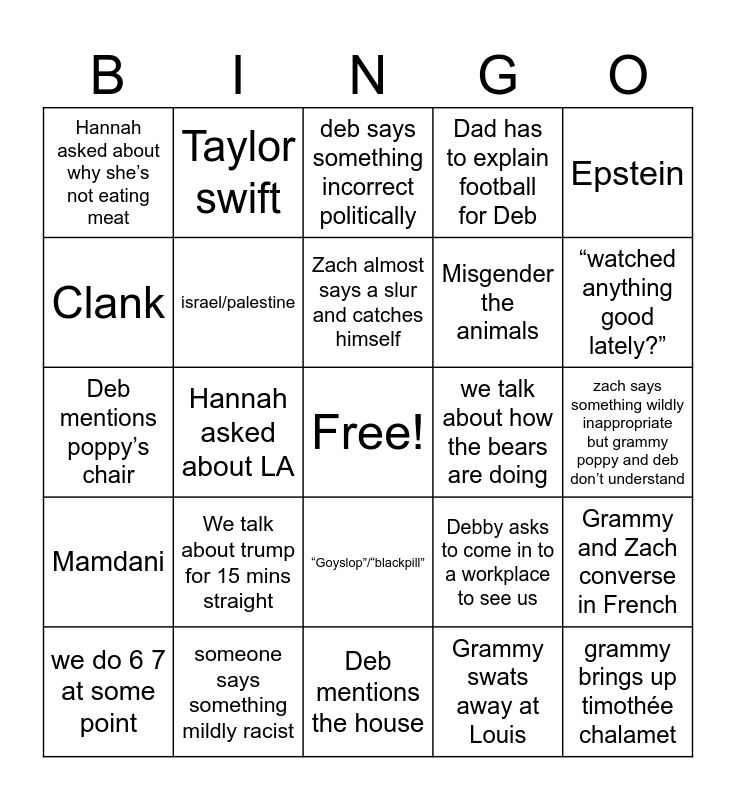 This bingo card has a free space and 29 words: we do 6 7 at some point, zach is asked where he wants to go to school and washu is floated despite him being stupid, Hannah asked about LA, Sassy asked about oakton, Hannah asked about why she’s not eating meat, deb says something incorrect politically, israel/palestine, We talk about trump for 15 mins straight, we talk about how the bears are doing, someone says something mildly racist, zach says something wildly inappropriate but grammy poppy and deb don’t understand, grammy brings up timothée chalamet, Deb mentions the house, Grammy swats away at Louis, “watched anything good lately?”, “read any good books lately?”, “Goyslop”/“blackpill”, Mamdani, Epstein, Deb mentions poppy’s chair, Debby asks to come in to a workplace to see us, Grammy mentions stuff in front of Deb that she shouldn’t, Misgender the animals, Clank, Dad has to explain football for Deb, Taylor swift, Grammy and Zach converse in French, Zach almost says a slur and catches himself and Sassy swears regularly.