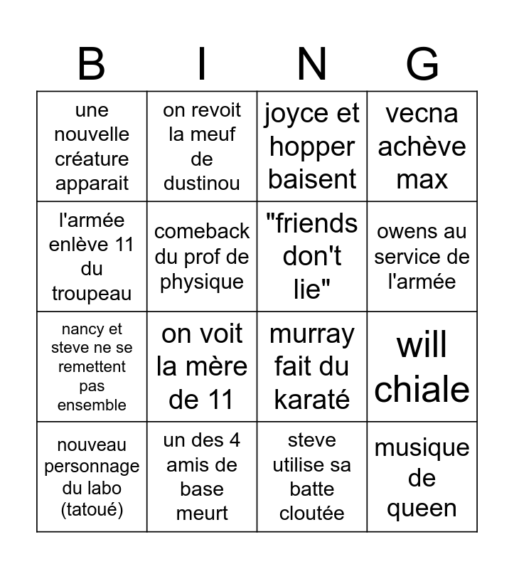 This bingo card has 16 words: un des 4 amis de base meurt, will chiale, joyce et hopper baisent, une nouvelle créature apparait, nancy et steve ne se remettent pas ensemble, on revoit la meuf de dustinou, murray fait du karaté, steve utilise sa batte cloutée, l'armée enlève 11 du troupeau, comeback du prof de physique, nouveau personnage du labo (tatoué), vecna achève max, on voit la mère de 11, owens au service de l'armée, "friends don't lie" and musique de queen.