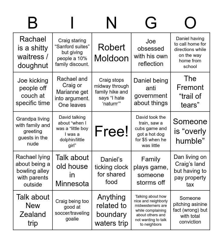 This bingo card has a free space and 29 words: Talk about New Zealand trip, Ants go marching / Craig embarrassed, David talking about “when I was a “little boy I was a dolphin/little girl”, Larry the lizard, Rachael is a shitty waitress / doughnut, Robert Moldoon, Rachael and Craig or Marianne get into argument. One leaves, Talk about old house in Minnesota, David took the train, saw a cubs game and got a hot dog for $5 when he was little, Craig being too good at soccer/traveling goalie, Someone is “overly humble”, Someone pitching asinine fact (wrong) but with total conviction, Anything related to boundary waters trip, Talking about how nice and neighborly midwesterners are while complaining about others and not wanting to talk to neighbors, The Fremont “trail of tears”, Daniel coming up from basement with blanket over head, Daniel’s ticking clock for shared food, Rachael lying about being a bowling alley with parents outside, Daniel having to call home for directions while on the way home from school, Grandpa living with family and greeting guests in the nude, Family plays game, someone storms off, “Just like hot potato” Daniel, Daniel being anti government about things, Joe kicking people off couch at specific time, Joe obsessed with his own reflection, Craig staring “Sanford suites” but giving people a 10% family discount., Dan living on Craig’s land but having to pay property tax, Craig stops midway through family hike and says “I hate ‘naturrr’” and Rachael’s story about supposed to be at the movie theater but sneaking out to go elsewhere, then getting caught with parents going to theater.