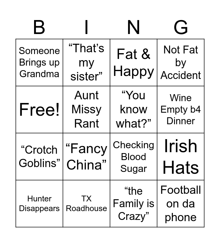 This bingo card has 16 words: TX Roadhouse, Irish Hats, Fat & Happy, Someone Brings up Grandma, “Crotch Goblins”, “That’s my sister”, Checking Blood Sugar, “the Family is Crazy”, Free!, Aunt Missy Rant, Hunter Disappears, Not Fat by Accident, “Fancy China”, Wine Empty b4 Dinner, “You know what?” and Football on da phone.