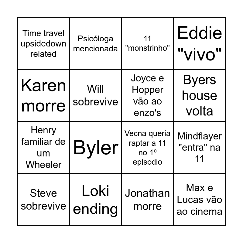 This bingo card has 16 words: Loki ending, Mindflayer "entra" na 11, 11 "monstrinho", Time travel upsidedown related, Henry familiar de um Wheeler, Psicóloga mencionada, Vecna queria raptar a 11 no 1º episodio, Jonathan morre, Karen morre, Will sobrevive, Steve sobrevive, Eddie "vivo", Byler, Byers house volta, Joyce e Hopper vão ao enzo's and Max e Lucas vão ao cinema.