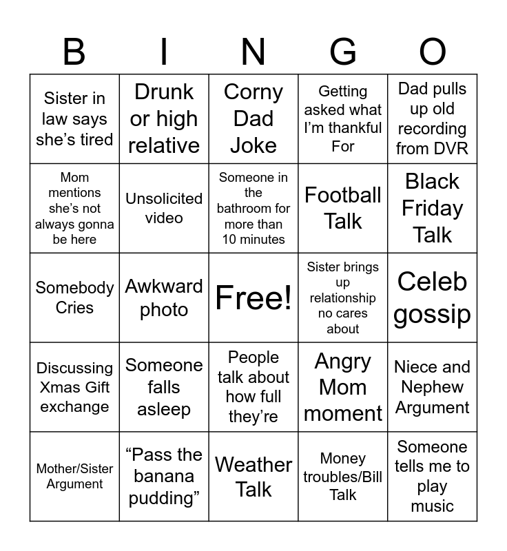 This bingo card has a free space and 24 words: Someone falls asleep, “Pass the banana pudding”, Someone in the bathroom for more than 10 minutes, Mother/Sister Argument, Dad pulls up old recording from DVR, Sister in law says she’s tired, Mom mentions she’s not always gonna be here, Drunk or high relative, Sister brings up relationship no cares about, People talk about how full they’re, Football Talk, Somebody Cries, Angry Mom moment, Niece and Nephew Argument, Unsolicited video, Money troubles/Bill Talk, Celeb gossip, Corny Dad Joke, Black Friday Talk, Awkward photo, Someone tells me to play music, Discussing Xmas Gift exchange, Getting asked what I’m thankful For and Weather Talk.