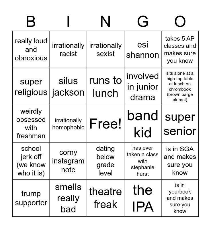 This bingo card has a free space and 24 words: corny instagram note, smells really bad, runs to lunch, trump supporter, takes 5 AP classes and makes sure you know, really loud and obnoxious, super religious, irrationally racist, band kid, dating below grade level, involved in junior drama, weirdly obsessed with freshman, has ever taken a class with stephanie hurst, is in SGA and makes sure you know, silus jackson, the IPA, super senior, irrationally sexist, sits alone at a high-top table at lunch on chrombook (brown barge alumni), irrationally homophobic, is in yearbook and makes sure you know, school jerk off (we know who it is), esi shannon and theatre freak.