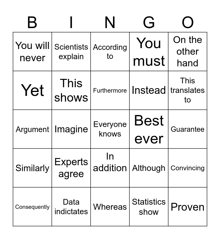 This bingo card has a free space and 39 words: Because of, As a result, Therefore, This shows, Consequently, In addition, Furthermore, However, On the other hand, Similarly, Imagine, You must, Proven, Guarantee, Best ever, Experts agree, Essential, You will never, Always, Although, Yet, Whereas, Instead, This translates to, Unlike, Conversly, Consequently, Meanwhile, Opposite, Scientists explain, Experts believe, Evidence suggests, According to, Data indictates, Statistics show, Persuasion, Convincing, Argument and In conclusion.