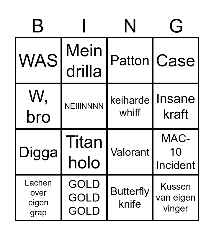 This bingo card has 16 words: GOLD GOLD GOLD, MAC-10 Incident, Patton, WAS, Digga, Mein drilla, Valorant, Butterfly knife, W, bro, NEIIINNNN, Lachen over eigen grap, Case, Titan holo, Insane kraft, keiharde whiff and Kussen van eigen vinger.