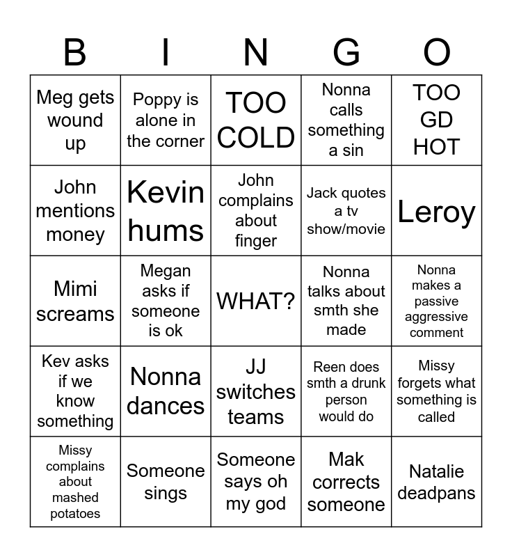 This bingo card has a free space and 24 words: Nonna dances, Someone sings, John complains about finger, Missy complains about mashed potatoes, TOO GD HOT, Meg gets wound up, John mentions money, Poppy is alone in the corner, Nonna talks about smth she made, JJ switches teams, Jack quotes a tv show/movie, Mimi screams, Reen does smth a drunk person would do, Missy forgets what something is called, Kevin hums, Mak corrects someone, Nonna makes a passive aggressive comment, TOO COLD, Leroy, Megan asks if someone is ok, Natalie deadpans, Kev asks if we know something, Nonna calls something a sin and Someone says oh my god.