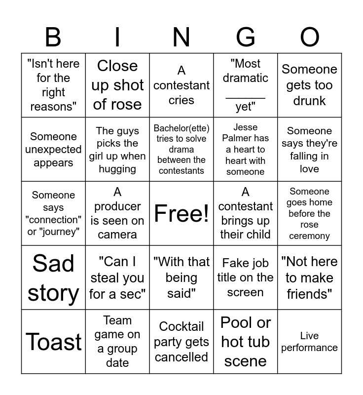 This bingo card has a free space and 29 words: Toast, Someone complains about not getting time, A producer is seen on camera, Someone says "always" after receiving a rose, "Isn't here for the right reasons", A contestant cries, The guys picks the girl up when hugging, "Can I steal you for a sec", A contestant brings up their child, Team game on a group date, Someone goes home before the rose ceremony, Live performance, Cocktail party gets cancelled, Pool or hot tub scene, Someone says they're falling in love, Someone sends themselves home, "With that being said", Sad story, Someone gets too drunk, Someone says "connection" or "journey", Fake job title on the screen, The bachelor(ette) cries, Jesse Palmer has a heart to heart with someone, Someone unexpected appears, "Most dramatic ______ yet", Close up shot of rose, "Not here to make friends", Bachelor(ette) tries to solve drama between the contestants and Bachelor(ette) kisses a contestant in front of other contestants.