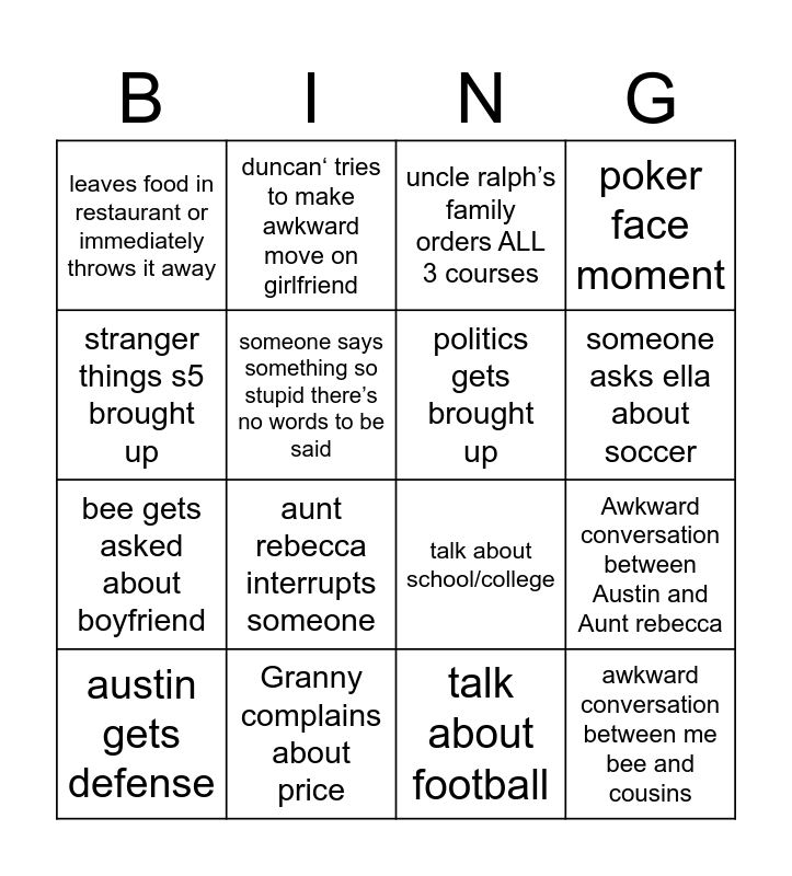 This bingo card has 16 words: Granny complains about price, Awkward conversation between Austin and Aunt rebecca, uncle ralph’s family orders ALL 3 courses, leaves food in restaurant or immediately throws it away, bee gets asked about boyfriend, duncan‘ tries to make awkward move on girlfriend, talk about school/college, talk about football, stranger things s5 brought up, someone says something so stupid there’s no words to be said, austin gets defense, poker face moment, aunt rebecca interrupts someone, someone asks ella about soccer, politics gets brought up and awkward conversation between me bee and cousins.
