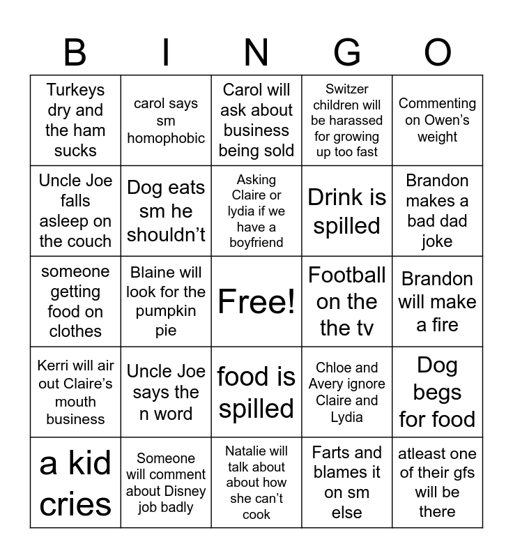 This bingo card has a free space and 24 words: Uncle Joe says the n word, Someone will comment about Disney job badly, Asking Claire or lydia if we have a boyfriend, a kid cries, Commenting on Owen’s weight, Turkeys dry and the ham sucks, Uncle Joe falls asleep on the couch, carol says sm homophobic, Football on the the tv, food is spilled, Drink is spilled, someone getting food on clothes, Chloe and Avery ignore Claire and Lydia, Dog begs for food, Dog eats sm he shouldn’t, Farts and blames it on sm else, Brandon will make a fire, Carol will ask about business being sold, Brandon makes a bad dad joke, Blaine will look for the pumpkin pie, atleast one of their gfs will be there, Kerri will air out Claire’s mouth business, Switzer children will be harassed for growing up too fast and Natalie will talk about about how she can’t cook.