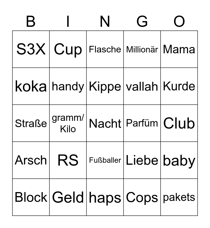 This bingo card has a free space and 24 words: RS, Geld, Kippe, Block, Mama, S3X, koka, Cup, Parfüm, Fußballer, vallah, Straße, Liebe, baby, handy, Cops, Club, Flasche, Kurde, gramm/ Kilo, pakets, Arsch, Millionär and haps.