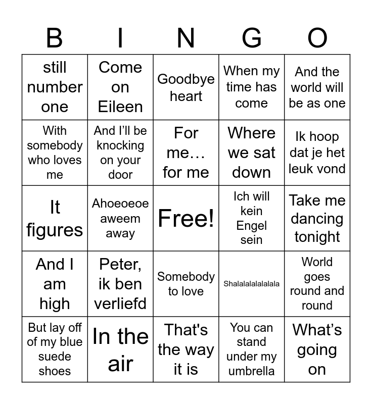 This bingo card has a free space and 33 words: ‘Caus when we kiss oh…fire, A dream you woke up from, Ahoeoeoe aweem away, All about that bass, And I am high, And I’ll be knocking on your door, And the world will be as one, But lay off of my blue suede shoes, Come on Eileen, En mijn zuster die heet Kee, For me… for me, Goodbye heart, I was still a child, I’m the great pretender, Ich will kein Engel sein, Ik hoop dat je het leuk vond, In the air, It figures, Peter, ik ben verliefd, Shalalalalalalala, Somebody to love, Steal her away from me, still number one, Take me dancing tonight, That's the way it is, What’s going on, When my time has come, Where we sat down, With somebody who loves me, World goes round and round, Yes I love you, Peggy Sue, You can stand under my umbrella and You’re never alone.