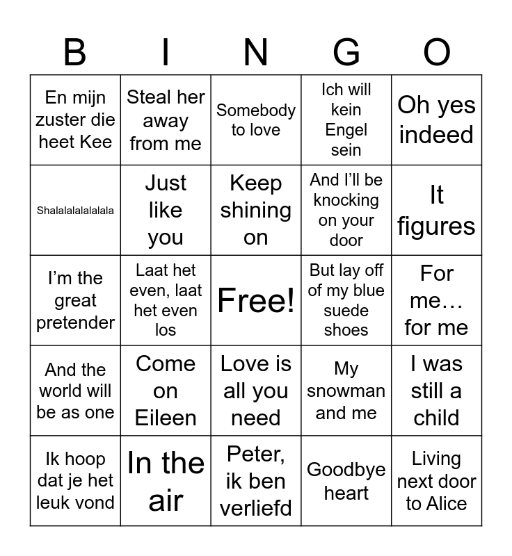 This bingo card has a free space and 27 words: My snowman and me, Oh let them rain, And I’ll be knocking on your door, Peter, ik ben verliefd, Shalalalalalalala, Somebody to love, Steal her away from me, And the world will be as one, But lay off of my blue suede shoes, I was still a child, I’m the great pretender, Ich will kein Engel sein, Ik hoop dat je het leuk vond, In the air, It figures, It’s fantastic, Just like you, Keep shining on, Come on Eileen, En mijn zuster die heet Kee, For me… for me, Goodbye heart, Laat het even, laat het even los, Living next door to Alice, Love is all you need, Oh yes indeed and On this winter’s night with you.