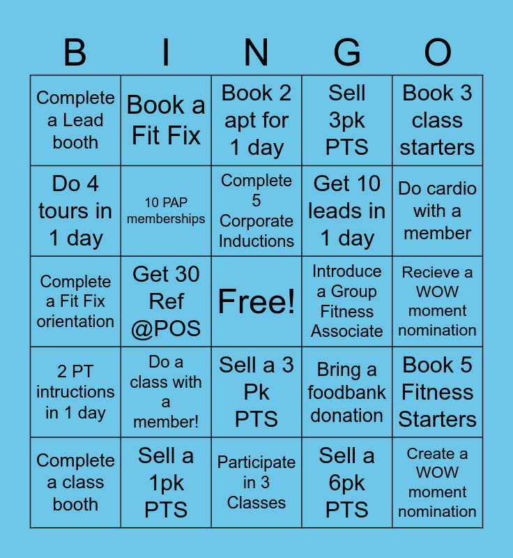This bingo card has a free space and 24 words: Do a class with a member!, Sell a 1pk PTS, Complete 5 Corporate Inductions, Complete a class booth, Book 3 class starters, Complete a Lead booth, Do 4 tours in 1 day, Book a Fit Fix, Introduce a Group Fitness Associate, Sell a 3 Pk PTS, Get 10 leads in 1 day, Complete a Fit Fix orientation, Bring a foodbank donation, Book 5 Fitness Starters, 10 PAP memberships, Sell a 6pk PTS, Recieve a WOW moment nomination, Book 2 apt for 1 day, Do cardio with a member, Get 30 Ref @POS, Create a WOW moment nomination, 2 PT intructions in 1 day, Sell 3pk PTS and Participate in 3 Classes.