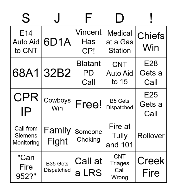 This bingo card has a free space and 42 words: Full First, Blatant PD Call, Cooking Error, Family Fight, CNT Triages Call Wrong, Rollover, Creek Fire, Cooking fire, Vincent Has CP!, Someone Choking, E25 Gets a Call, E28 Gets a Call, Cowboys Win, Chiefs Win, Fire at Story and 101, Fire at Tully and 101, Food Item Mentioned in a Call, CPR IP, 17B1G, 6D1A, 68A1, E17 Auto Aid to CNT, E4 Auto Aid to CNT, E14 Auto Aid to CNT, CNT Auto Aid to 9, CNT Auto Aid to 14, CNT Auto Aid to 15, PD Runs Someone Named Matt, Fire at a Golf Course, Someone Wearing Flannel, Someone Without Shoes, Call from Siemens Monitoring, 32B2, Call at a LRS, Weapon NOT a gun or knife mentioned, "Can Fire 952?", B35 Gets Dispatched, B5 Gets Dispatched, Luis Asks for the Phone Charger, Vehicle Vs Ped, Medical at a Gas Station and Fire at a Gas Station.