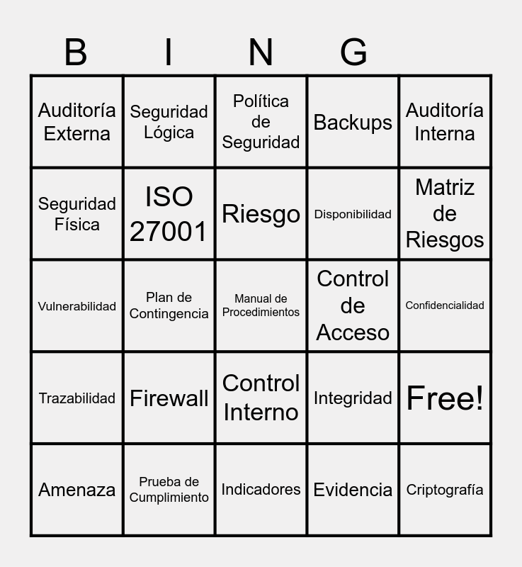 This bingo card has 26 words: Control Interno, Evidencia, Riesgo, Prueba de Cumplimiento, Auditoría Interna, Auditoría Externa, Seguridad Física, Seguridad Lógica, Confidencialidad, Integridad, Disponibilidad, Vulnerabilidad, Free!, Amenaza, Plan de Contingencia, Recuperación ante Desastres, Backups, Trazabilidad, Política de Seguridad, Manual de Procedimientos, Matriz de Riesgos, Indicadores, Control de Acceso, Firewall, ISO 27001 and Criptografía.